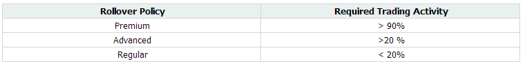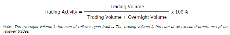 Trading Activity reflects the trader’s tendency to trade intraday more frequently than to keep positions overnight. Trading Activity is recalculated on a daily basis at the settlement time and the rollover policy is defined according to the percentage levels below: