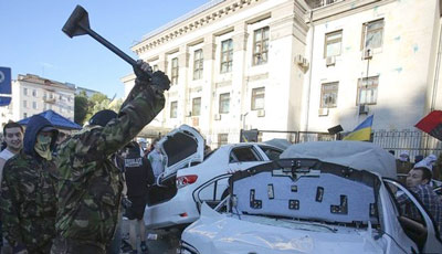 Moscow reacted angrily to a violent protest outside its embassy in Kiev on Saturday after separatists shot down a Ukrainian military plane, killing all 49 people on board.
