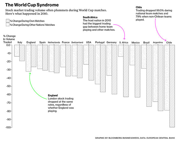 With the World Cup well underway, it’s no surprise that workers everywhere—even financial types—are paying more attention to the games than to their jobs. One way of measuring the global epidemic of distraction is to look at plunges in stock market trading volumes. The European Central Bank analyzed data from the 2010 World Cup showing significant drops in trading during all games. The effect was especially pronounced when the traders’ own country was on the field.