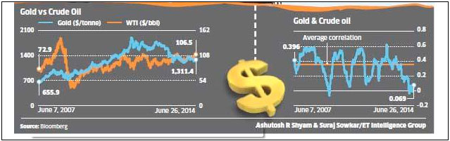 Crude and gold have moved together for the past five year as investors sought to diversify into commodities from equities and bonds. But now, globally, investors are buying crude oil and selling gold. Gold holding of exchange-traded funds has reached 1,714 metric tonnes, its lowest since July 2009.