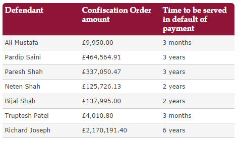 In a case brought by the Financial Conduct Authority (FCA) a total of £3,249,488.71 were made by His Honour Judge Pegden QC between 10 September 2014 and 15 September 2014 against Ali Mustafa, Pardip Saini, Paresh Shah, Neten Shah, Bijal Shah, Truptesh Patel and Richard Joseph.