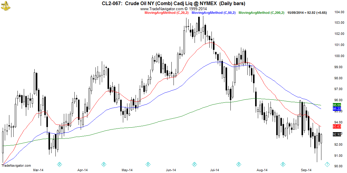 Crude oil sell-off on Monday found support at the $90.50 level and turned back higher to close just beneath resistance at $93.00. Market looks likely to continue bouncing around at these levels. Close above resistance higher up at the 20 DMA at $93.63 is needed for upswing to continue.