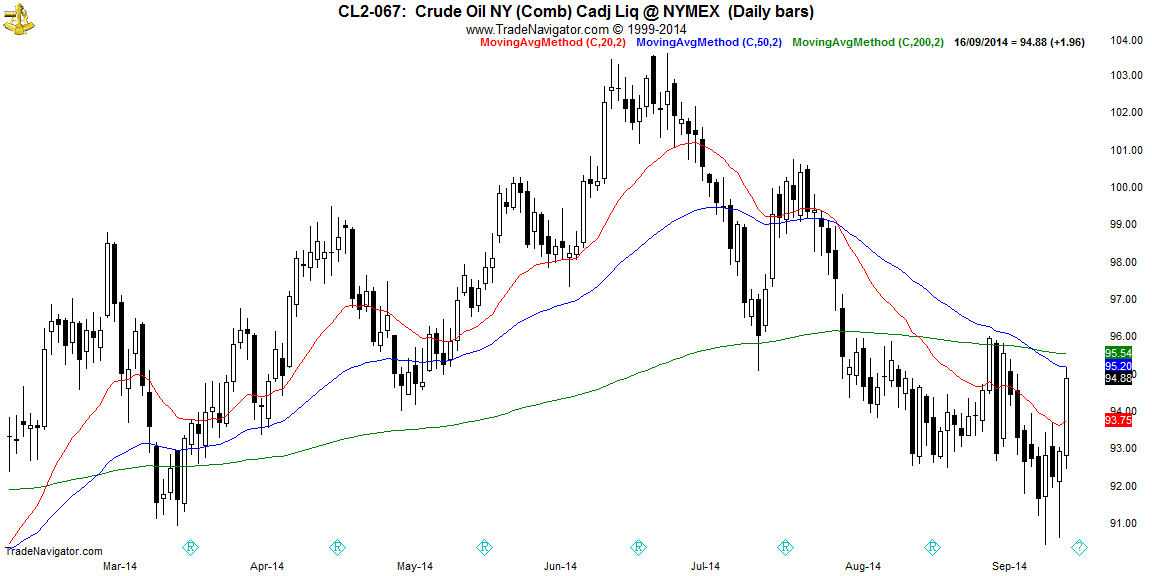 Crude Oil upswing with a close above the 20 DMA and a test of the 50 DMA. Resistance at the $95.00 area proved significant. A close above extends action towards $96.00. Support at $93.00.