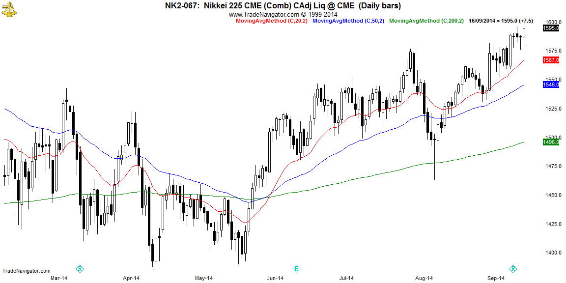NIKKEI 225 Bullish day for the Nikkei with a close at 1595 and much closer to the 1600 key resistance level. A close above the 1600 area is very bullish for the Nikkei. Support at the 1580 level.