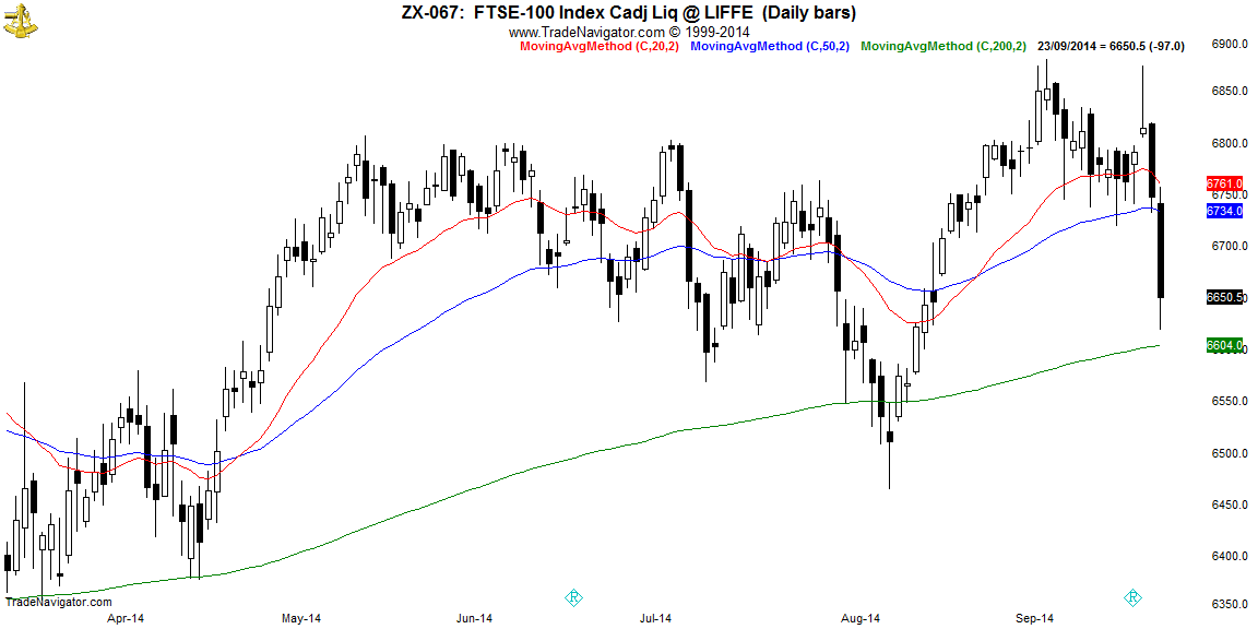 FTSE100 Strong sell-off in the FTSE with a close at the 6650 level. Declines might be followed by a bounce but action in the FTSE suggests weakness and lower prices on the horizon and a possible test of the 200 DMA.