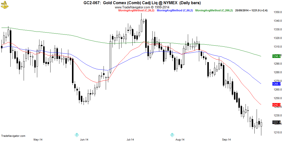 Gold New intraday low for DEC 14 Gold at 1206. Gold is looking to form a base just above $1200 but ultimately is likely to break below and head lower in the mid-term. Bearish.