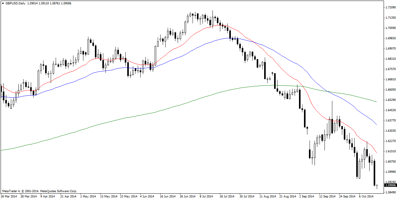 GBP/USD essentially collapsed through the 1.60 handle and tested the 1.59 area dipping below intraday. The pair is looking weak and likely to retest 1.59 support area again. A close below suggests further downside with 1.5820 being the next big support area. Bearish – sell only market at the moment.
