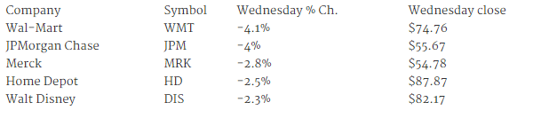 But that’s not to belittle the tremendous pain being experienced by a majority of the stocks in the Dow. Just as you’d expect, financials and tech are getting hit. JPMorgan Chase (JPM) is the biggest loser in the Dow, falling 4.5%. And retailer Wal-Mart (WMT) is off 4.1%.