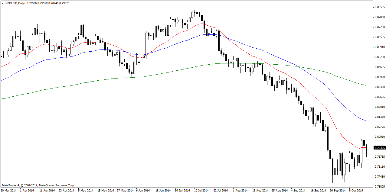 NZD/USD dipped below the 20 DMA which proved supportive and bounced back to close at the 0.7950 area. Resistance above at 0.80 handle. Pair is in consolidation, range bound mode. Bearish.