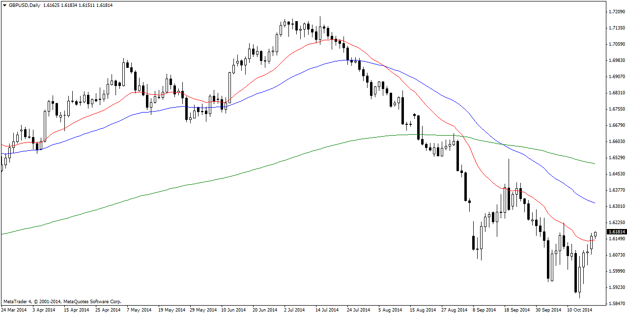 GBP/USD broke above the 20 DMA and key resistance area at 1.6160. Upswing suggests a test of the 1.62 handle is likely and a close above extends to the 1.6250 resistance area. Bullish momentum appears to have some legs and possible to continue pushing the pair higher.