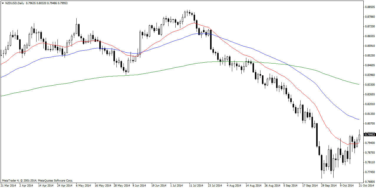 NZD/USD broke above the 20 DMA finding resistance at 0.7977. Pair likely to test the 0.80 handle. A close above extends price to the 0.8070 area. Market in range bound mode. Long term bearish bias remains.