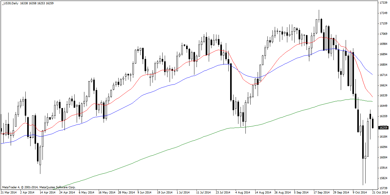 Dow 30 The Dow Jones sold off in the early session of Monday trading but managed to turn back and close higher for the day at 16338. The Dow appear that it has some work to do to edge higher however positive momentum in the general US indices is likely to spill into the Dow.