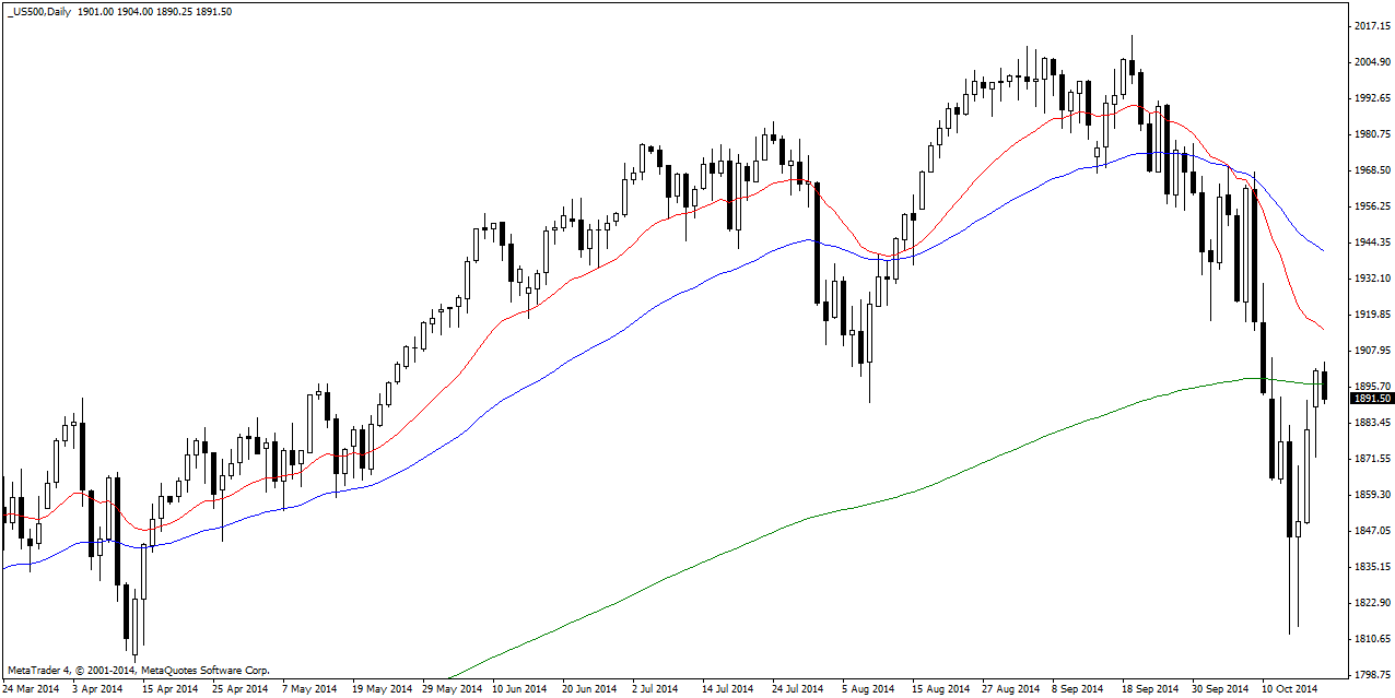 S&P 500 rallied above the 200 DMA and the key 1900 resistance level on Monday. This is bullish for the index and signals to bulls to start buying again. The S&P is likely to recover some of the recent losses and push higher as it becomes evident that a bottom might already be in the past. A dip back to recent lows changes this outlook.