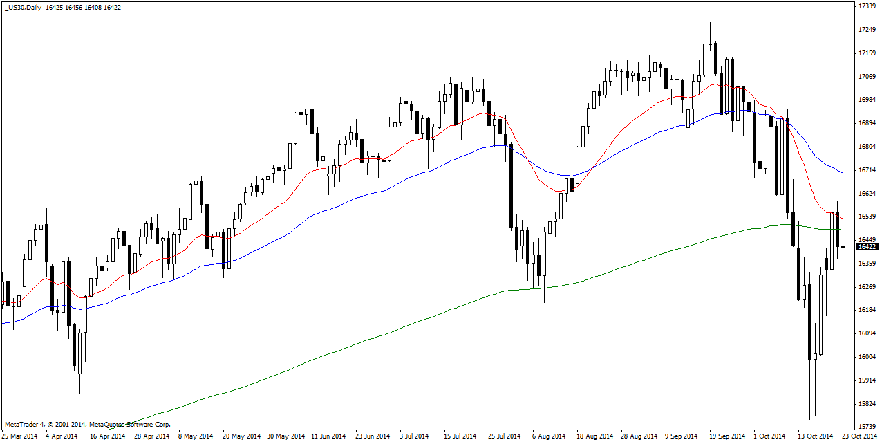 Dow 30 The DOW fell below the 200 DMA and briefly dipped below 16400 on Wednesday. Resistance above at 16540 and support below at 16340. The index is at a key juncture and a close back above the 200DMA puts the Dow back into an upward trajectory.