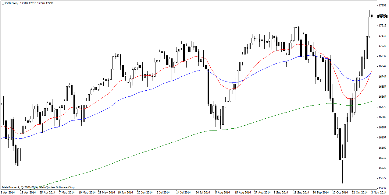 Dow 30 The Dow broke out on Friday following through with the general bullish sentiment in the markets. The climb above the 17350 mark and new all-time high suggests that this bull market has more room to run. Bullish.