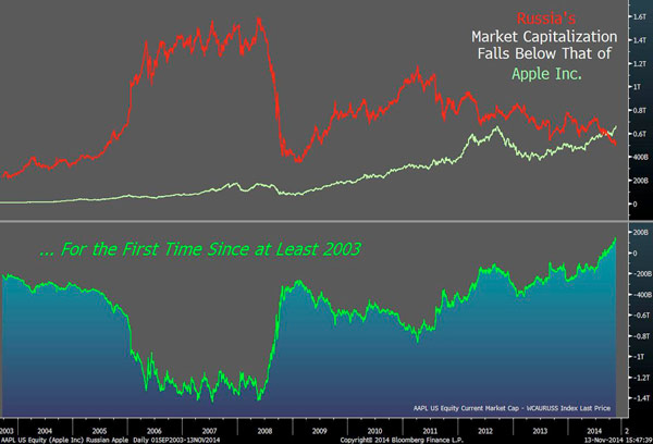 If you owned Apple Inc., and sold it, you could purchase the entire stock market of Russia, and still have enough change to buy every Russian an iPhone 6 Plus.
