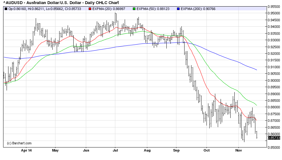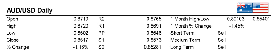 Strong sell off in the AUDUSD pair as USD strength persists giving back mostly all the gains from previous sessions finding support at the 0.8600 area. A break below sees a test of the November 11 low which opens up new down leg potentially leading to the June 2010 lows of 0.83.