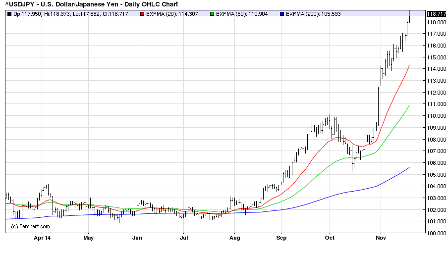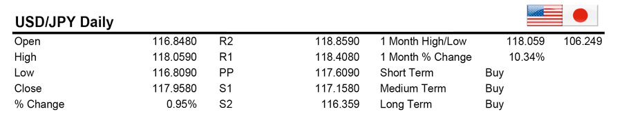 Strong showing for the day with a break above 118.00 solidifying the upward path of the USDJPY which continues to be driven by QE. Close at October 2007 high of 117.95 suggests pair to bounce back up from here in the short term with a real target of 120.00 becoming imminent.