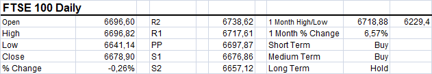 The FTSE ended the day on a negative note despite finding support at the 6640 area making up some of the early session losses. Price action suggests FTSE remains in upward price trajectory. A close back above 6700 needed to have a chance of making new highs.