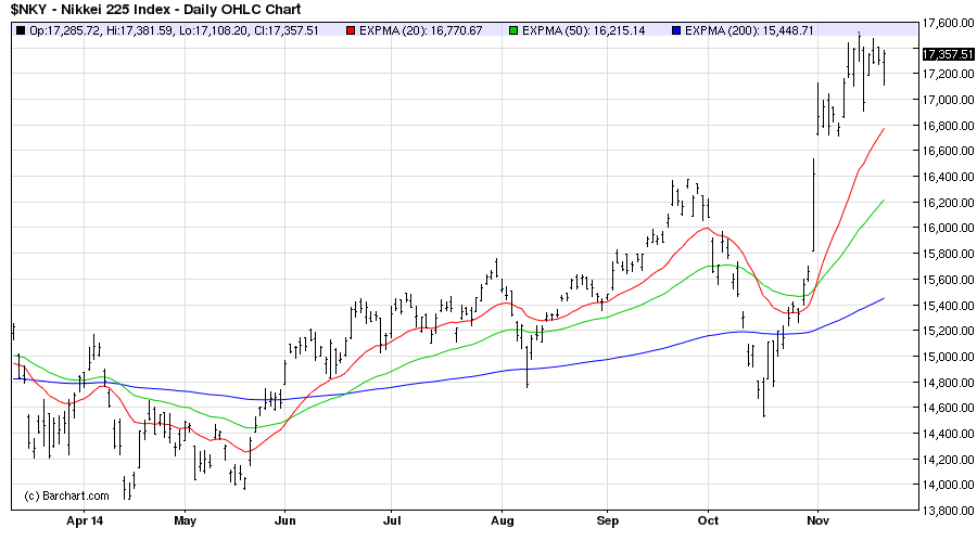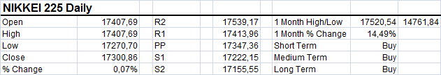 The Nikkei close on the key 17300 mark managing to edge slightly higher on the day after breaking out and testing the 17400 area which proved to be too resistive for now. The Nikkei is likely to continue consolidating at these levels prior to entering a new up leg.