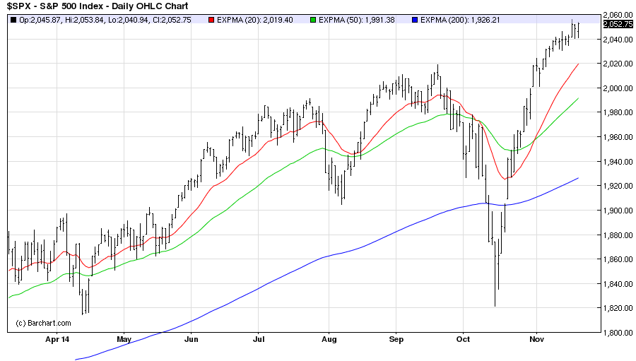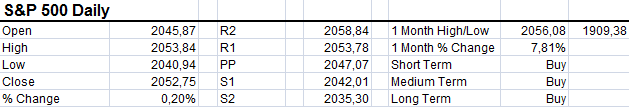 The S&P 500 traded within a tight trading range on Thursday ending the day on modest gains after dipping into the 2040 area which proved to be supportive enough. Action suggests that the market remains strongly bullish with 2100 continuing to be realistic target.