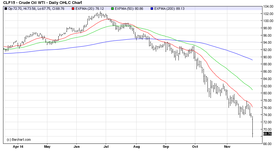 Crude Oil collapsed on Thursday breaking below the $70 barrier and making new lows as a Crude Oil price war appears to be kicking off between the OPEC producers and US Shale Gas producers. Crude Oil is a strong sell with lower prints imminent. High volatility to be expected.