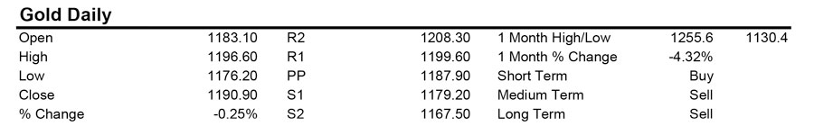 Light trading session on the day with Gold closing slightly lower on the day breaking below the $1190 handle on the day. Gold looks ready to go lower and is likely to break lower with a short term target of revisiting the $1150 handle. Support in the $1175-80 area.
