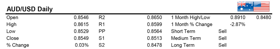 AUDUSD ended the day essentially unchanged after trying to rally and faltering, finding resistance in the 0.8610-20 area. Weakness dominates price action this pair which is strongly biased to the downside. Looking for new lows in this pair as bearish momentum picks up.