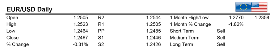 Strong resistance in the 1.2520 area pushed EURUSD lower on the day. Limited upside potential for the pair which is rather berish on all time frames. Range bound action with a bias to the downside remains in the short term. Support at the 1.24 level important, a break below extends to recent low of 1.2360.