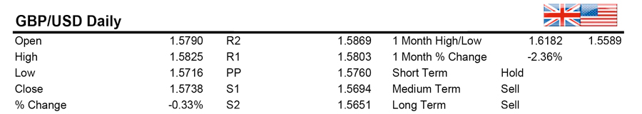 Decline for GBPUSD which traded lower on the day hovering around the 1.57 range. Support below in the 1.5650. A break below extends to 1.5600-15590 area which is the recent low and opens up down leg to the 1.55 handle. On the upside the 20 DMA level at the 1.5790 area appears strong resistance.