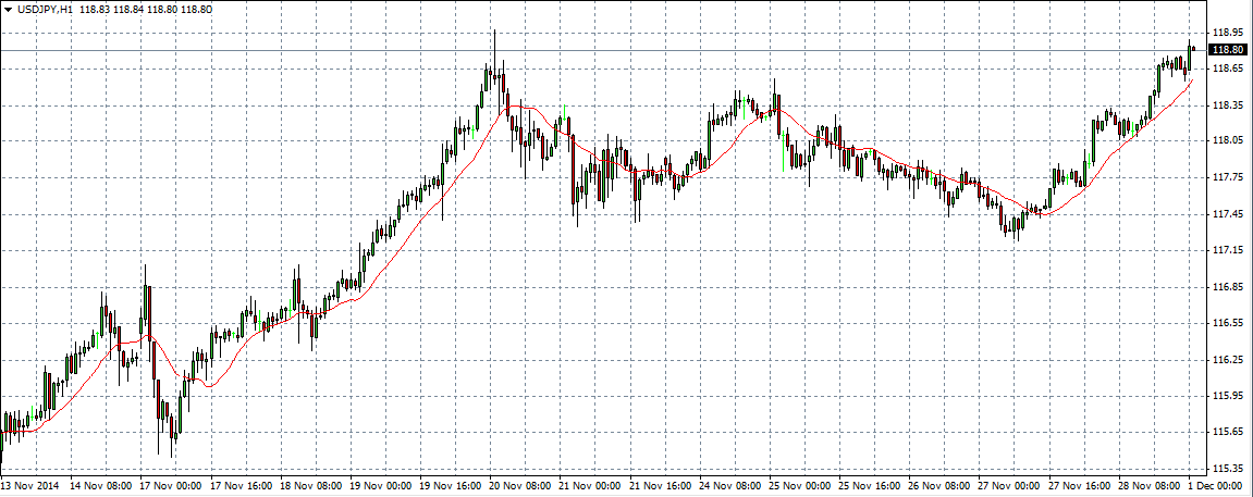 USD/JPY trading at 118.8 area and trying to reach 119 for now. The next target after 119 area has been breached will be 120 and a reversal under 118 will bring the market to sideways again. Long term uptrend is very strong, bullish.