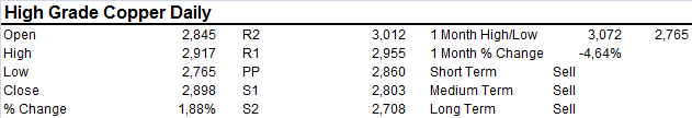 Copper managed to put in a respectable 2% gain on Monday following a test of support in the $2.75 area. Bearish bias remains strong with Copper likely to edge lower after consolidating recent price action. Resistance now in the $2.90-95 area. A close above sees a retest of $3.00.