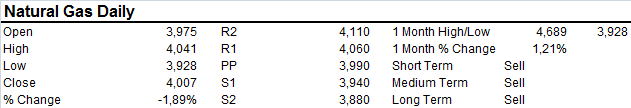 Natural Gas dipped below $4.00 after gapping lower on the open. NG volatility remains exceptionally high with a strong downside bias. Support further below at $3.75-80 a break of which extends to $3.50 in the short term. On the upside a close back resistance is in the $4.10-50 area.