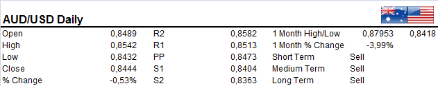 AUDUSD attempt to rally faltered with bears stepping in to take control pushing the pair into negative territory. Bearish momentum still high with market likely to retest recent lows. A close below extends to 0.84 handle. A clean close this figure see the Aussie $ heading to 0.8250 in the medium term. Upside potential is limited with resistance at 0.8460-80. Pair is a strong sell.