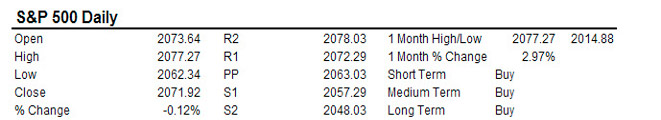 The S&P sold off in the early session on Thursday only to turn back and close the day marginally negative. Support below at 2050-60 appears to contain any further downside for the S&P. Consolidation and further upside on the horizon for the S&P.