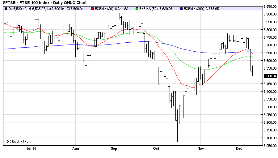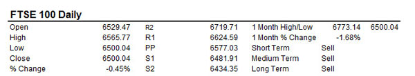 The FTSE found support at the 6500 level closing at the lows of the day and making a new monthly low. Price action suggests the FTSE is going lower as downside pressure increases. Volatility likely to increase as the FTSE tests resistance beneath at 6480-450.