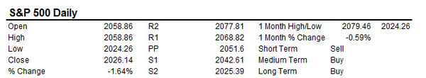 The S&P 500 sold off heavily on Wednesday closing at the lows of the day. The S&P charts looks damaged on the short term time frame with a possibility of further downside extending into the 2000 level which is a solid support area. A break beneath the 50 DMA at 2020 confirms this scenario.