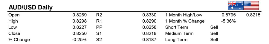 AUDUSD attempt to rally during the early session ran out of steam which saw the market ending the day on a negative note. Market at a critical point in the 0.8250 area. A decisive break beneath and violation of 0.82 handle extends to 0.80 in the medium/longer term. Any rallies in between likely to be short lived and without sustainability.