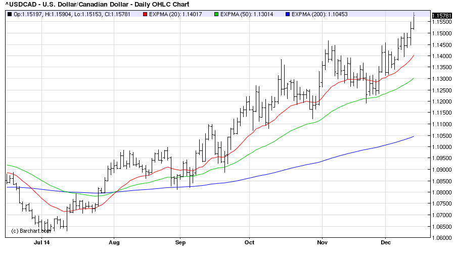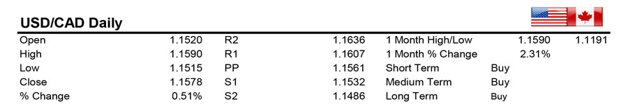 Bullish day for the USDCAD which finally managed to break well into the 1.15 handle and make a run for 1.16 stopping short by 10 pips. USDCAD appears to be heading higher and a close above 1.16 confirms this. Pullbacks at this point likely to be treated as entry points as opposed to triggering sustained sell-offs.