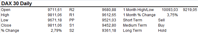 Very good day for DAX which gapped on the open and headed higher from there. Bullish sentiment has returned to the market with a likely push towards 9900 very realistic. Support beneath at 9650.