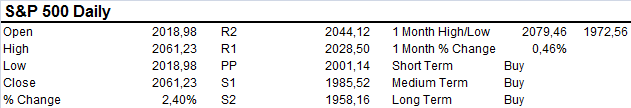 The S&P 500 pushed higher on the day breaking past resistance at 2020 and clearing the 2050 level with ease. Yesterdays price action suggests that downswing/correction phase likely to be over with the S&P entering a new up leg. Resistance above at 2085-90. A close above extends to 2100.