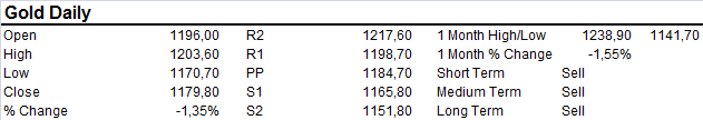 Gold broke down on Monday breaking below the $1180 support figure with support holding at $1170. Yesterdays action signals Gold is ready to go lower with a possible test of recent lows at $1141. Bearish with further downside coming.