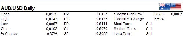 AUDUSD faced downside pressure with low liquidity making a new low on the day. Next target to the downside 0.8050-60 area. A break here extends to July 2009 low of 0.80. Bulls thin on the ground and any upside likely to meet resistance at 0.8145-65.