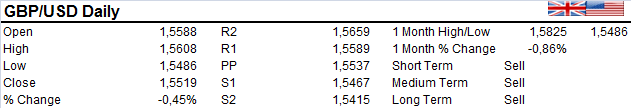 Downside pressure continues to push cable lower with a new monthly low on the day suggesting bears remain in full control of this market. A close below 1.55 extends to 1.5425 with a likelihood of further downside pushing the pair into 1.5250 area. Resistance on the upside at 1.5600-10 handle.