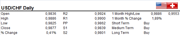 USDCHF broke to a new yearly high on the day breaking out of its recent consolidation phase. Next target on the upside 0.9898 which is the August 2012 high. Some profit taking and pull back likely at these levels with support below at 0.9840-50 area.