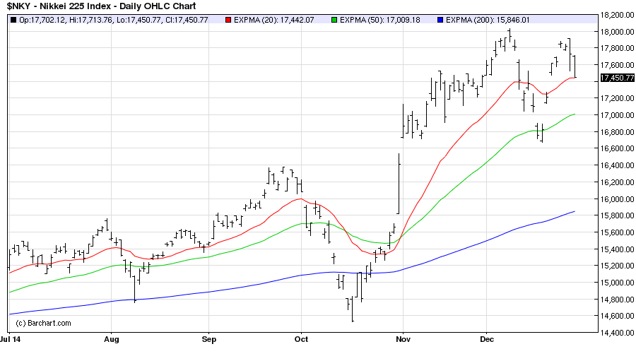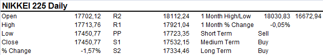 The NIKKEI sold off briefly on Tuesday finding support at the 20 DMA/17450 area. The NIKKEI is in consolidation mode with medium/longer term bullish momentum still intact. A break above 17700 opens new up leg with a target of 17900-18000.