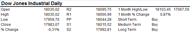 The DOW ended the day on a negative note finding support at 17950. Correction and consolidation of recent gains very much a normal part of this bull run. Bullish momentum remains intact with a break back above 18000 likely seeing the rally resuming to new highs.