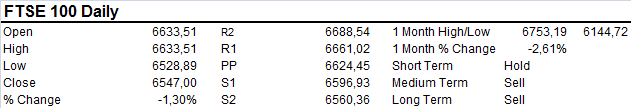 FTSE broke lower on Tuesday slicing through the 20 and 50 DMA’s with ease suggesting further downside might be in store. Support at 6500-20. A break beneath 6500 extends correction into the 6450 area at first instance.