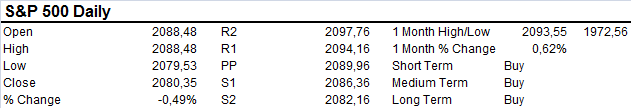 The S&P 500 sold off briefly on Tuesday giving up much of the gains from the previous session. Market appears to be well supported in the 2080 area with bias to the upside. A close above the recent high extends to 2100.