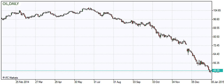 US crude oil rose Wednesday, snapping a four-session losing streak after a dip below $47 a barrel earlier in the day as a weekly US inventories report showed a surprise drop in crude supplies. WTI for February delivery rose 1.5% to settle at $48.65 a barrel on the New York Mercantile Exchange. There are no signs that the current bearish trend will reverse in short term as analysts from Bank of America Merrill Lynch estimate that Non-OPEC and OPEC producers don’t plan curbing output and it will take time for the global demand to increase with lower prices.